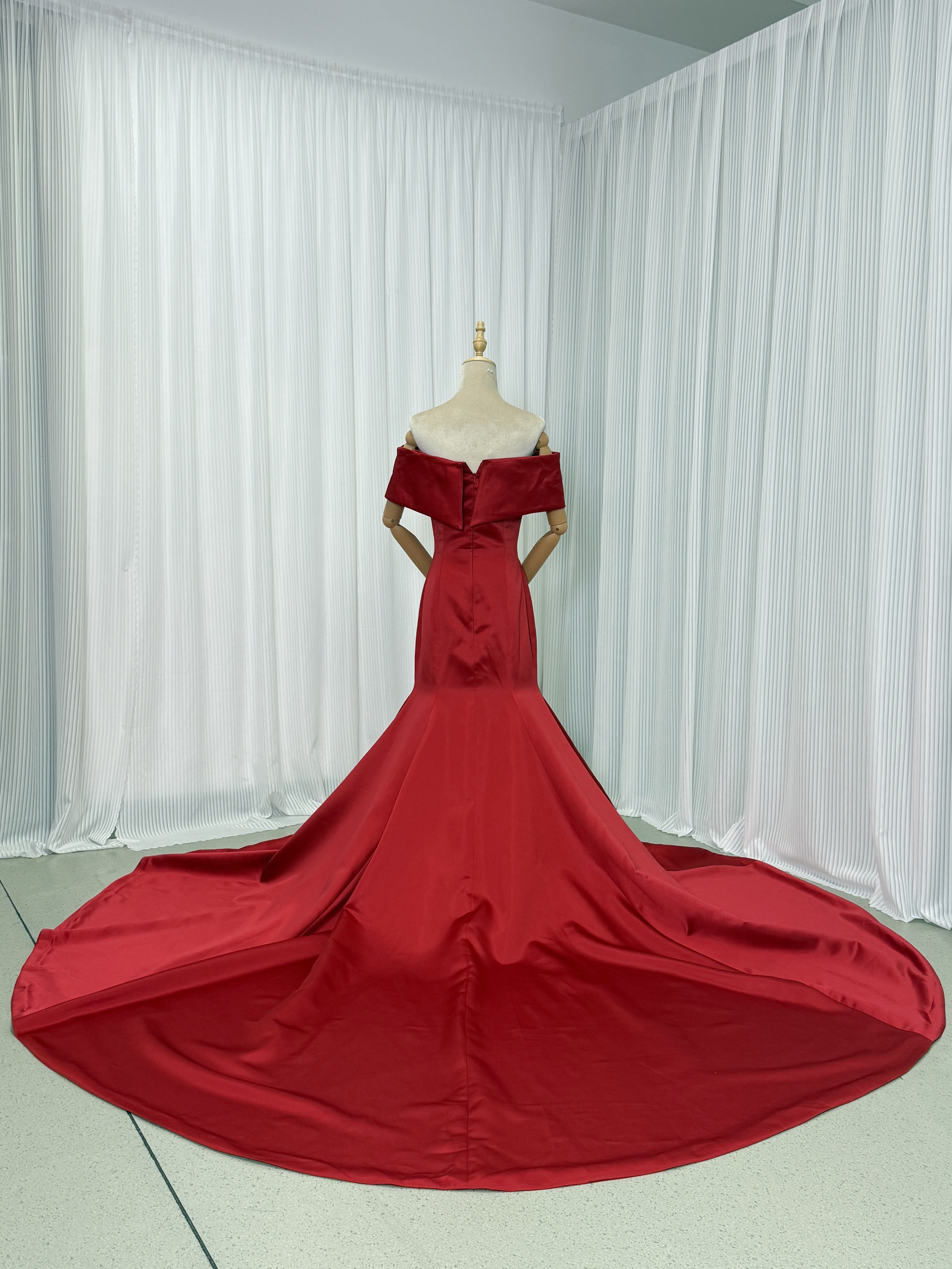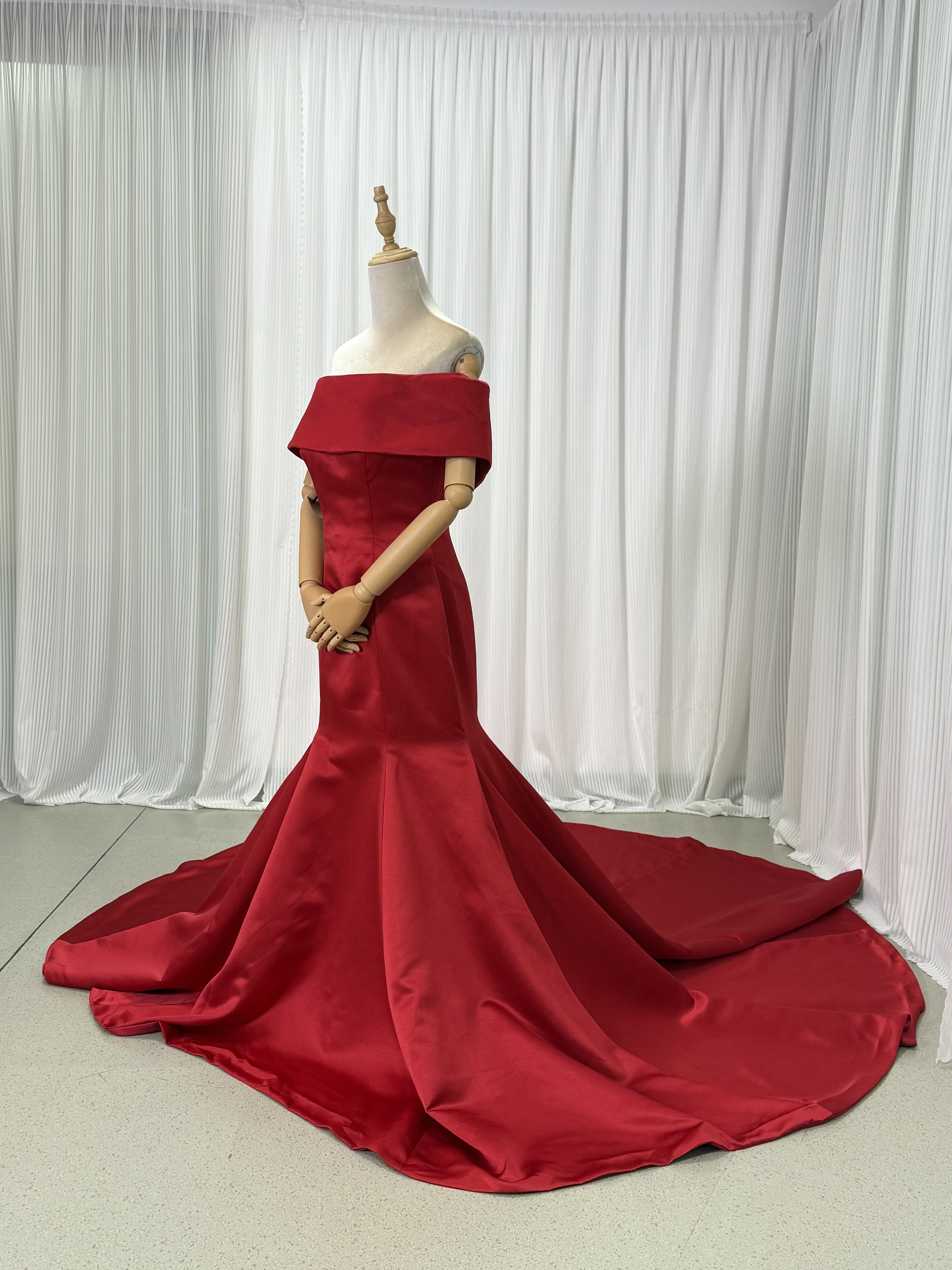 カラードレス ワインレッド オフショルダー マーメイドライン 細見えシルエット 華やかなトレーン 花嫁 光沢サテン