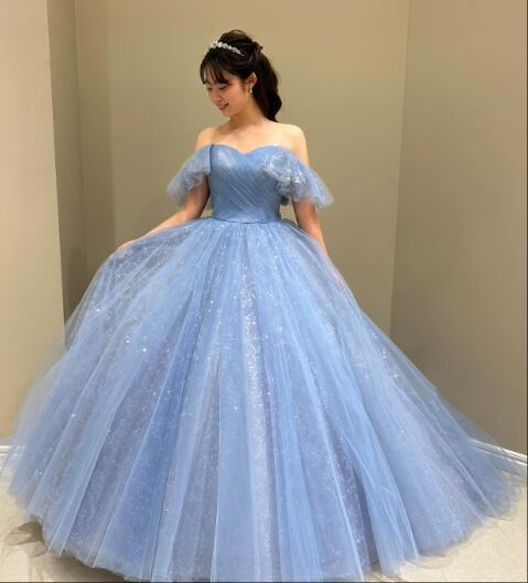 カラードレス 爽やかで優しいブルー オフショルダー キラキラグリッターチュール 編み上げ 花嫁 ふわふわドレス
