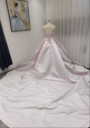 カラードレス 薄桃色 ベアトップ ビスチェタイプ 光沢サテン 華やかなトレーン プリンセスライン 可愛い 花嫁