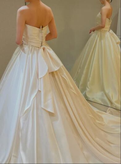 ウエディングドレス オフホワイト ベアトップ 光沢サテン 結婚式 前撮り 華やかなトレーン シアーな美しさ アンティークなドレス