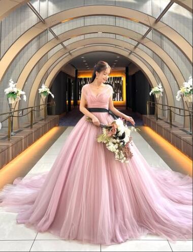 カラードレス ピンク オンショルダードレス サッシュベルト 華やかなトレーン プリンセスライン 花嫁