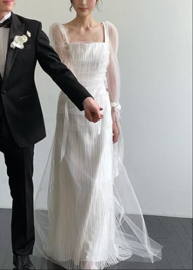 ウエディングドレス ホワイト スクエアネック ロングスリーブ リボン ロング 前撮り ソフトチュール