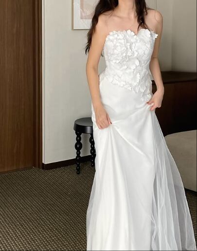 人気上昇! ウエディングドレス ホワイト ベアトップ 編み上げ 花モチーフ スレンダーライン ロング 前撮り チュールドレス