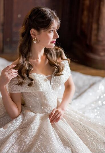 人気上昇! ウエディングドレス オフホワイト オフショルダー ふっくら柔らかなバックリボン 華やかなトレーン プリンセスライン キラキラドレス