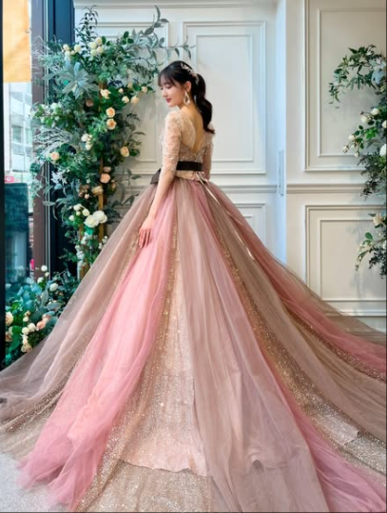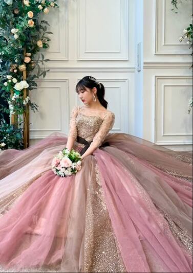 カラードレス ピンク 七分袖丈 サッシュベルト 華やかなトレーン プリンセスライン 花嫁 前撮り キラキラグリッターチュール レイヤードドレス