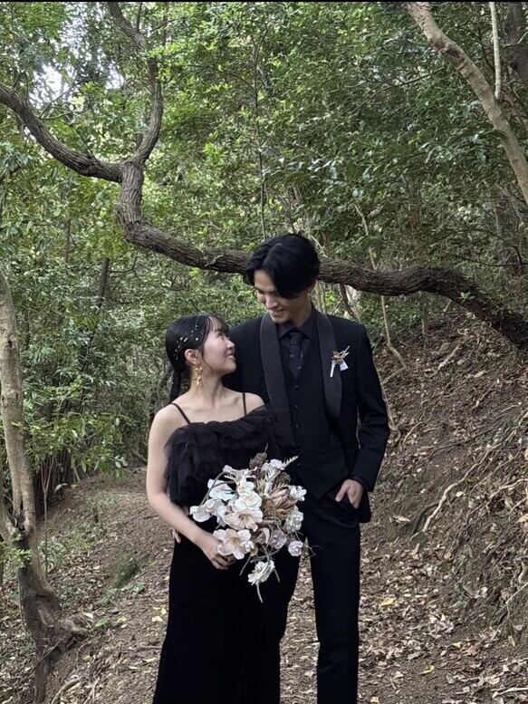 実例写真! カラードレス キャミソール 花嫁 ブラック オフショルダー マーメイドライン 短トレーン