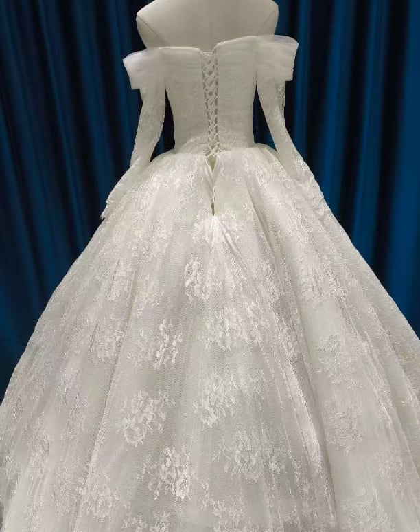 ウエディングドレス オフホワイト オフショルダー バラトレーン 編み上げ 贅沢な総レース ロングスリーブ 結婚式