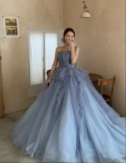 カラードレス 爽やかで優しいブルー チューブトップ 華やかなトレーン ソフトチュール 花嫁 前撮り 柔らかく重ねたチュールスカート