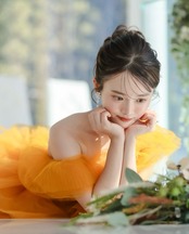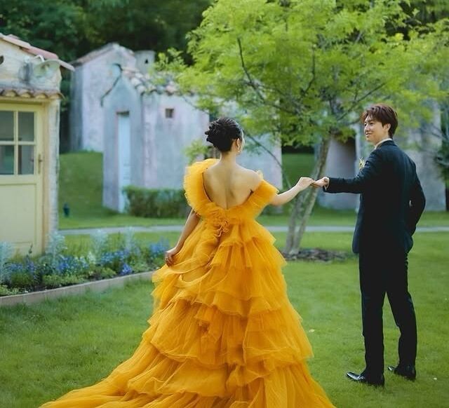 オレンジイエローカラードレス プリーツ トレーン 前撮り オフショルダー