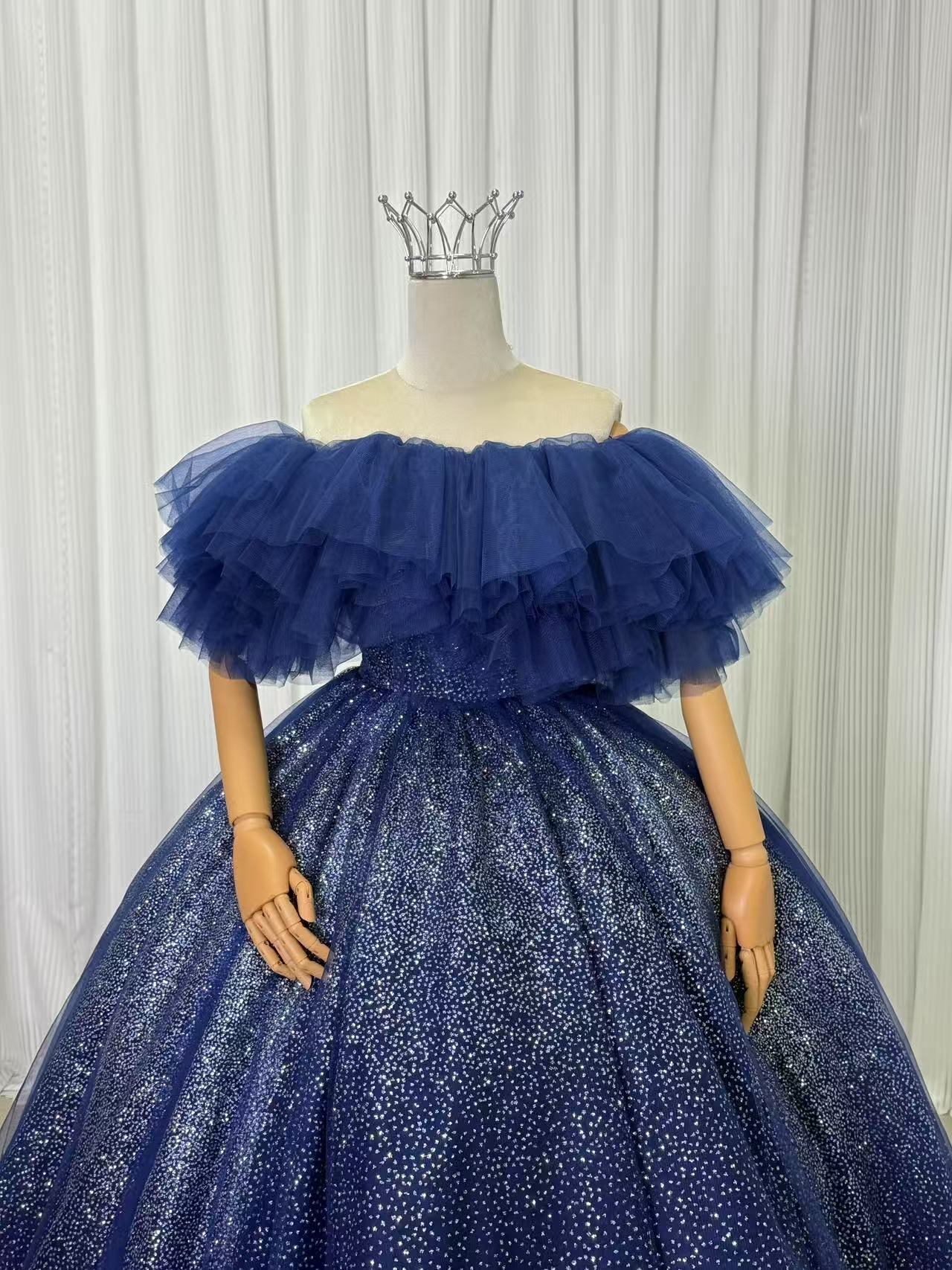 カラードレス ネイビー キラキラグリッターチュール オフショルダー 編み上げ 花嫁 華やかなトレーン グリッタードレス