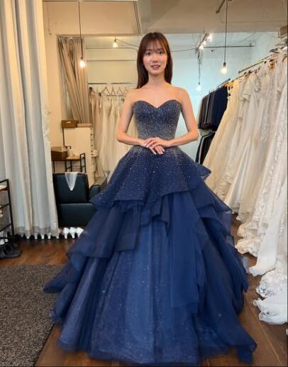 上品! カラードレス ベアトップ ブルー 編み上げ キラキラチュール 華やかなトレーン 前撮り 結婚式 レイヤードドレス