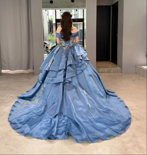 上品! カラードレス 爽やかで優しいブルー オフショルダー キラキラ光る刺繍 華やかなトレーン 編み上げ 光沢サテン プリンセスライン