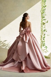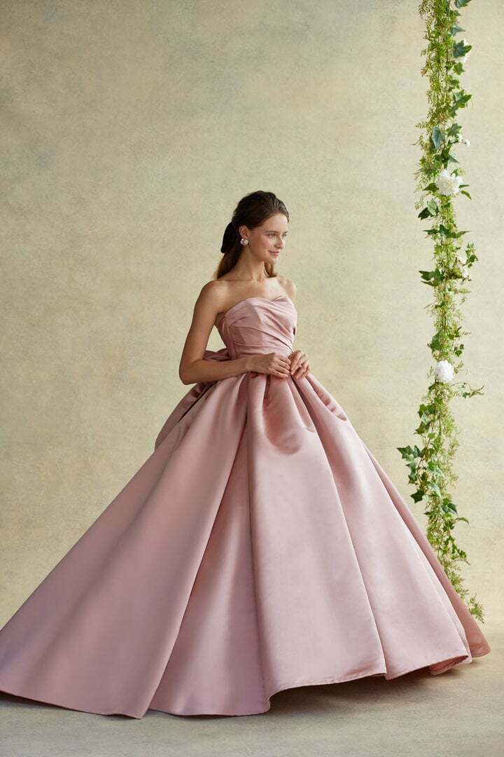 カラードレス くすみピンク ベアトップ 立体ドレープ 光沢サテン 華やかなトレーン 花嫁/前撮り