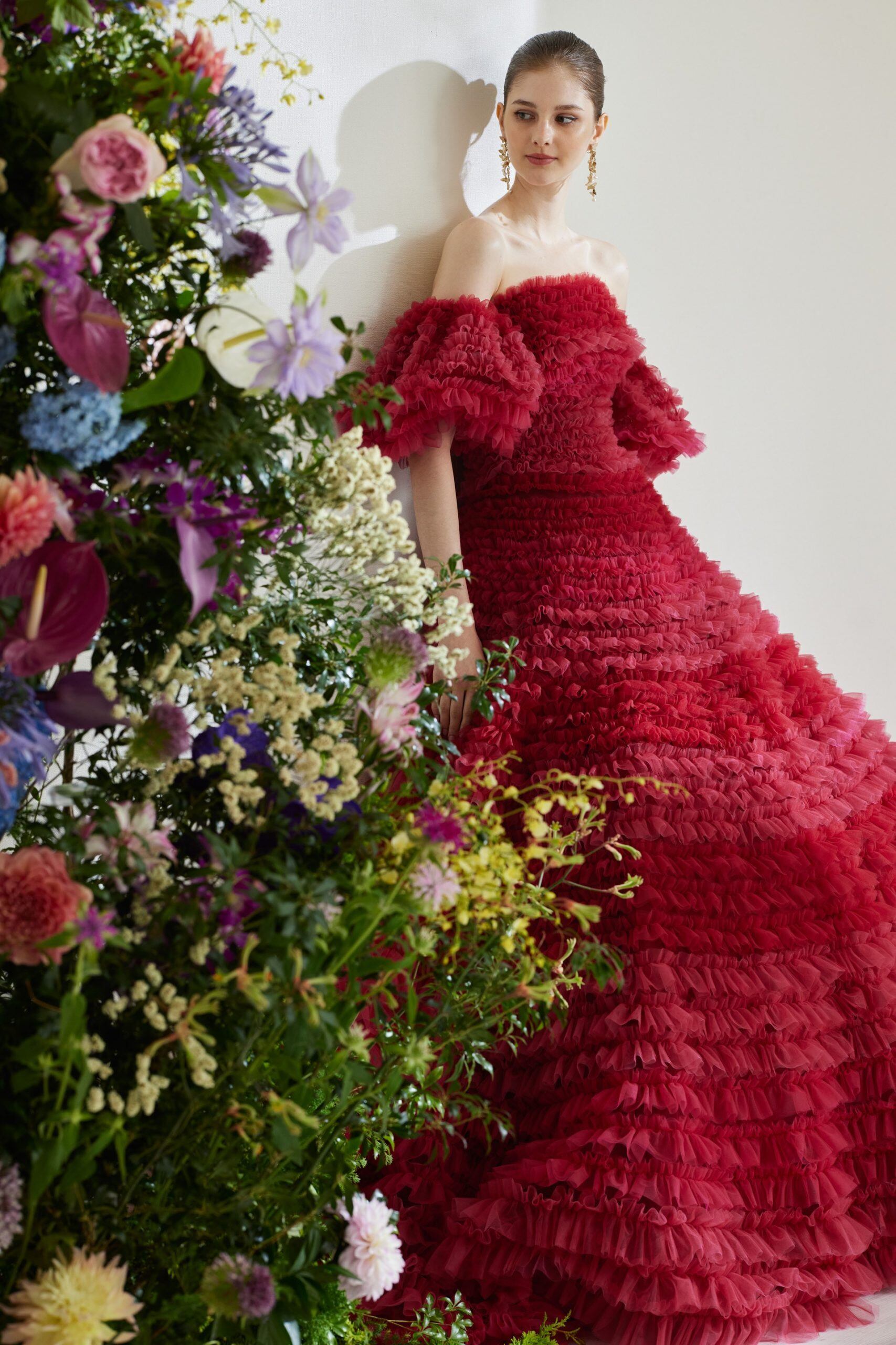 カラードレス フレア袖 ワインレッド 華やかなトレーン ラッフルフリル 花嫁/前撮り サッシュベルト もこもこドレス