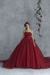 カラードレス ボルドー色 ベアトップ 上質オーガンジー 華やかなトレーン ふっくら柔らかなバックリボン ロングワンピース