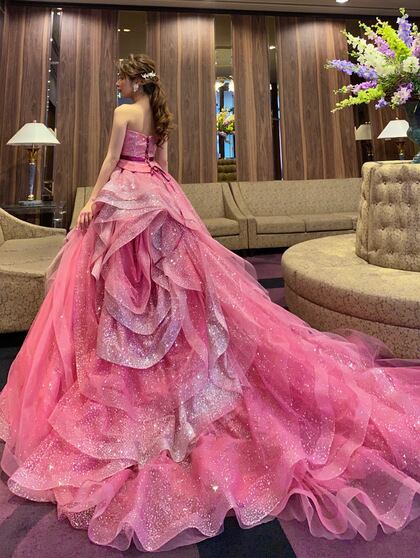 カラードレス ピンク キラキラグリッターチュール ベアトップ 編み上げ プリンセスライン 華やかなトレーン 結婚式 レイヤードドレス