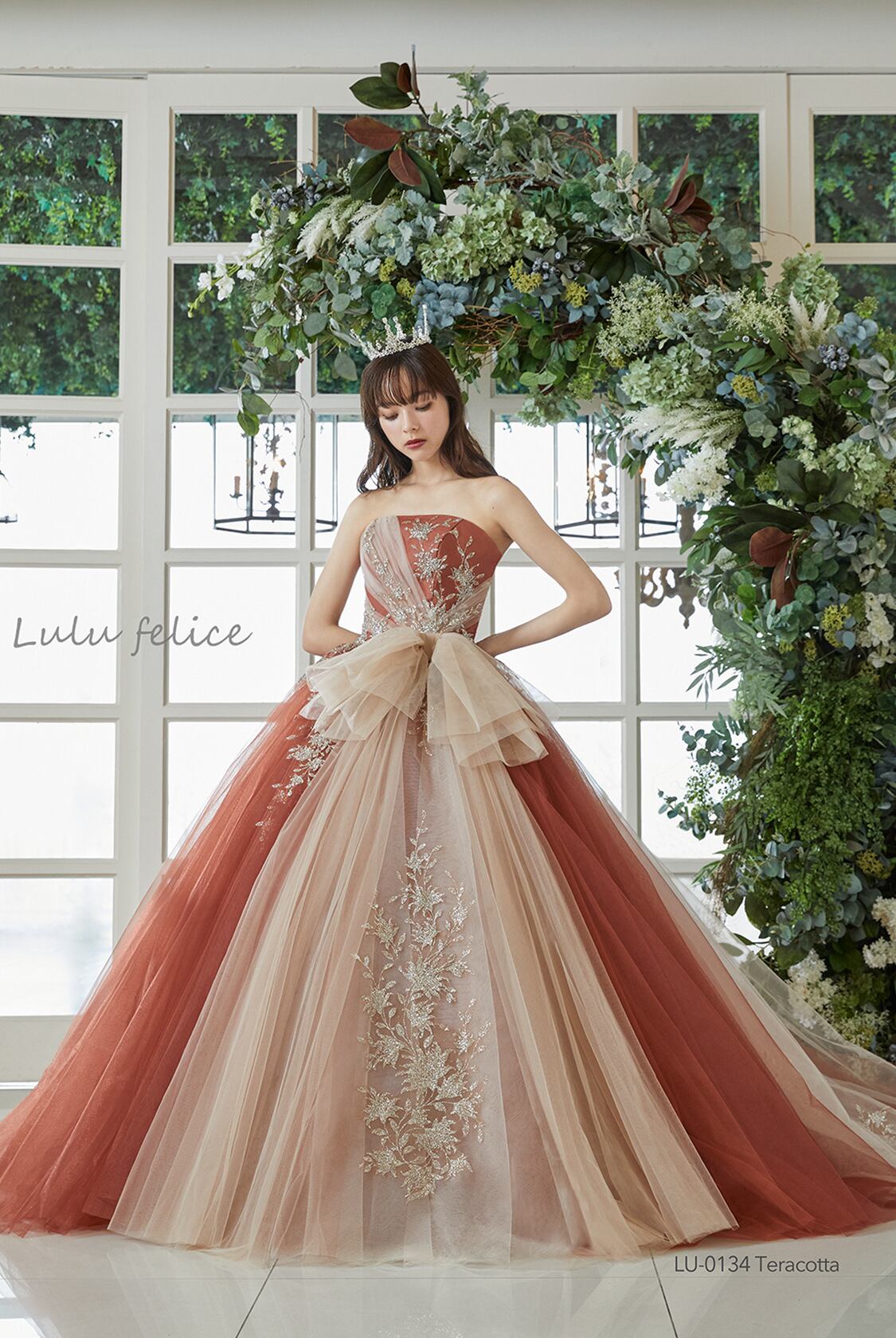 カラードレス テラコッタ色 ベアトップ 繊細レース ロングトレーン 花嫁/前撮り ソフトチュール ロングドレス