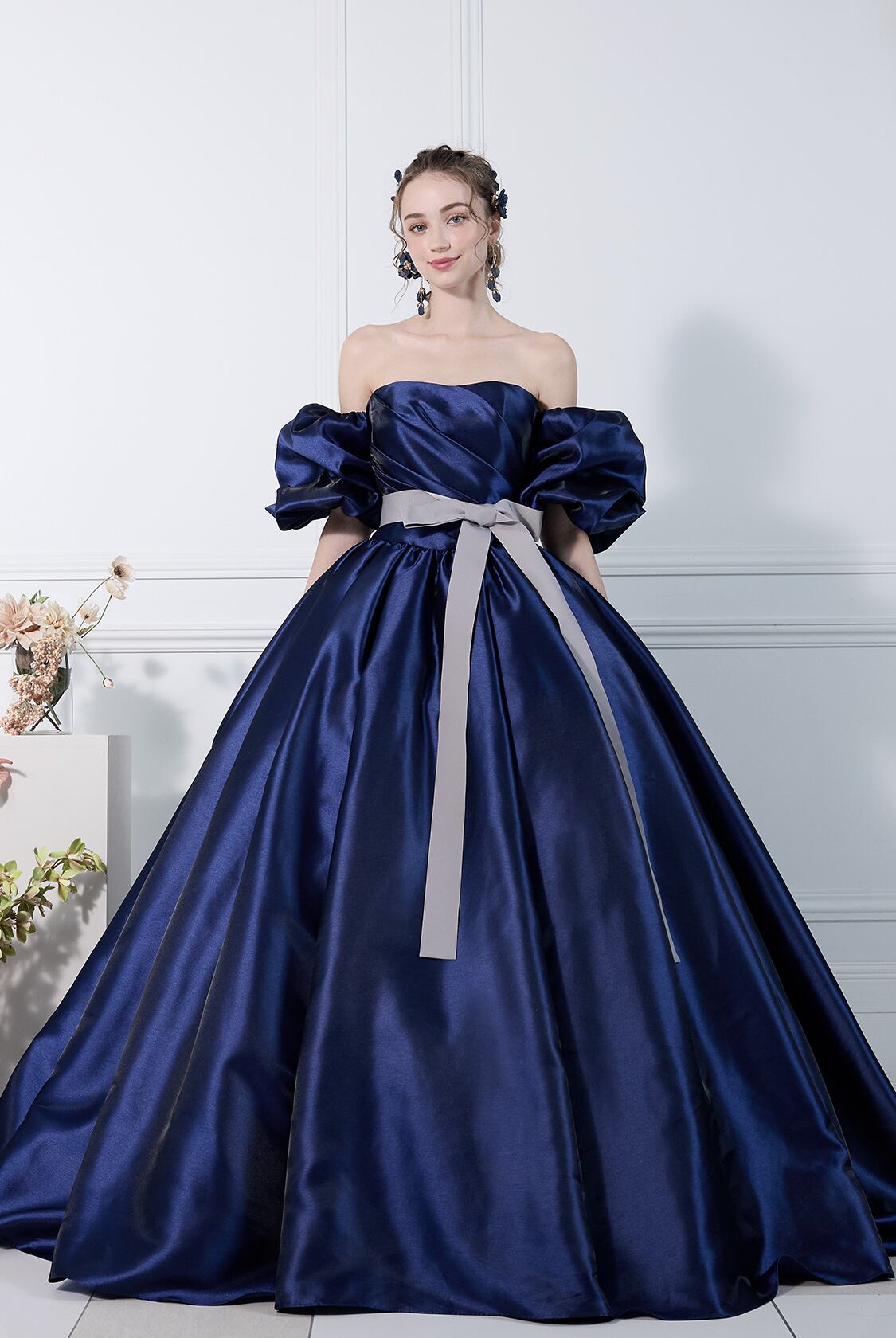 美品!カラードレス 紫青 取り外し袖 取り外しオフショルダー 光沢サテン サッシュベルト 花嫁/前撮り ボリュームドレス