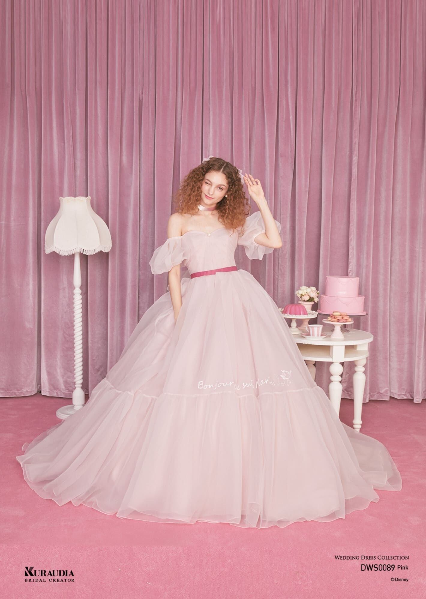 カラードレス ピンク プリンセスライン 取り外し袖 上質オーガンジー ふっくら柔らかなバックリボン ロングトレーン 前撮り