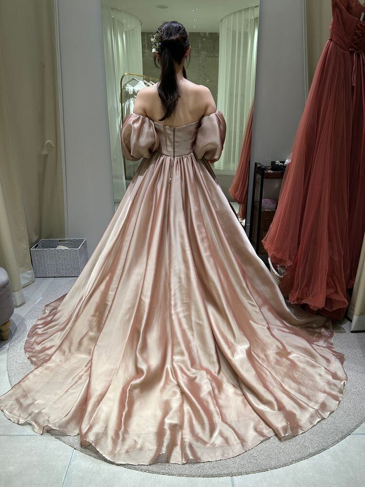 カラードレス ピンク フレア袖 光沢サテン ファスナー 華やかなトレーン 前撮り 人前式