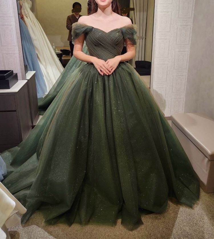 カラードレス 深めな緑 オフショルダー 編み上げ キラキラグリッターチュール 華やかなトレーン 人前式/前撮り