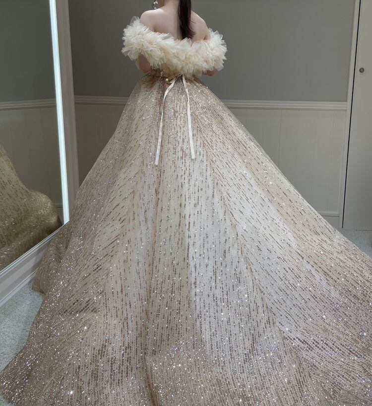 カラードレス シャンパン色 オフショルダー 編み上げ キラキラチュール ロングトレーン 花嫁 前撮り