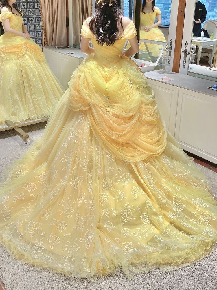 カラードレス パステルイエロー オフショルダー パール スリット 上品レース 華やかなトレーン 前撮り