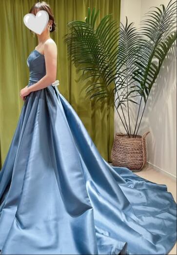 カラードレス 爽やかで優しいブルー ベアトップ スリット 華やかなトレーン 光沢サテン 花嫁 前撮り