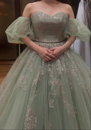 カラードレス グリーン パフスリーブ キラキラ光る刺繍 編み上げ ソフトチュール 華やかなトレーン 花嫁 前撮り