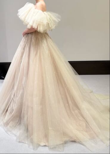 カラードレス シャンパン色 オフショルダー ソフトチュール キラキラチュール トレーン スレンダーライン 花嫁