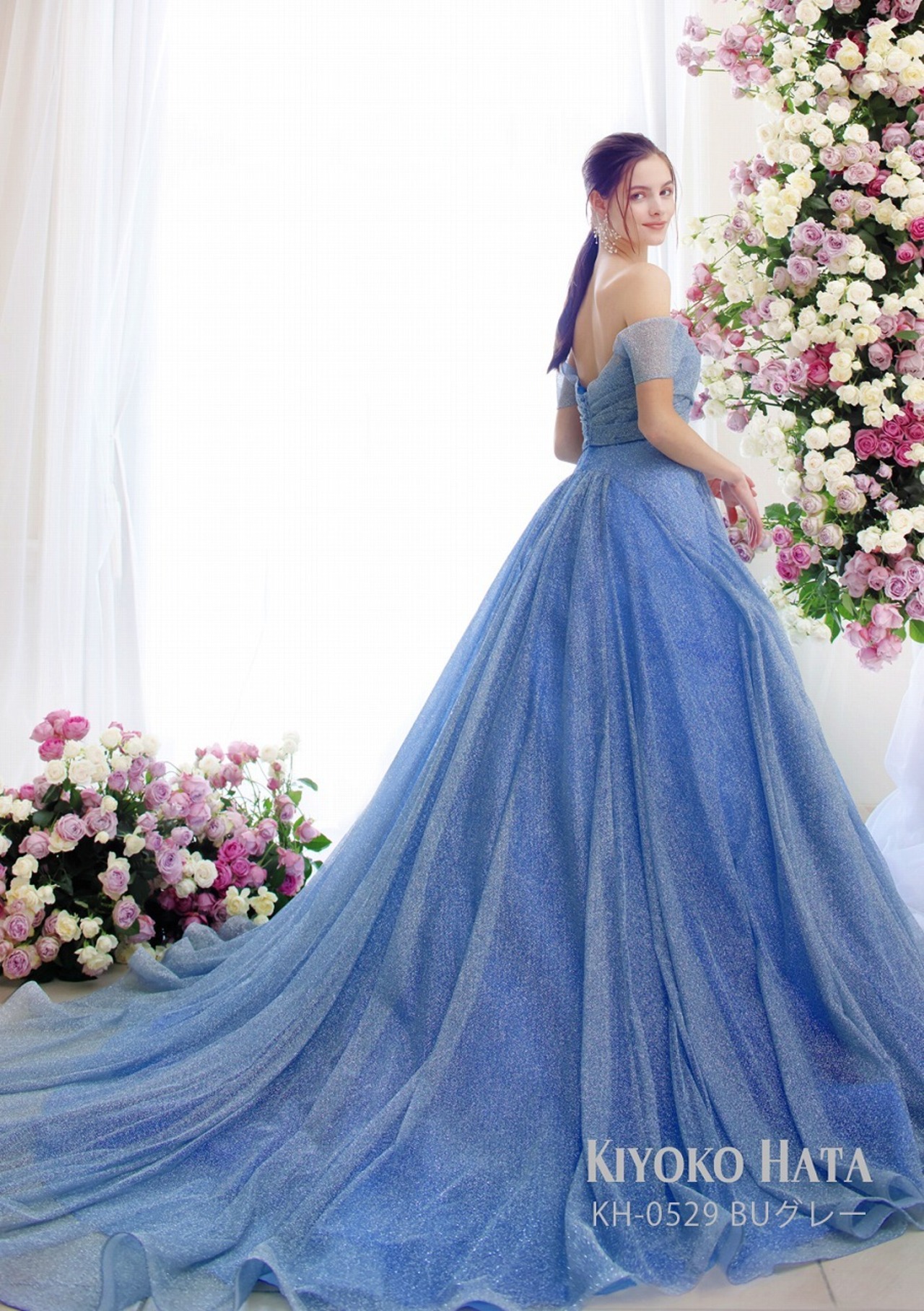 カラードレス 爽やかで優しいブルー 取り外し袖 華やかなトレーン キラキラグリッターチュール スレンダーライン 花嫁 前撮り