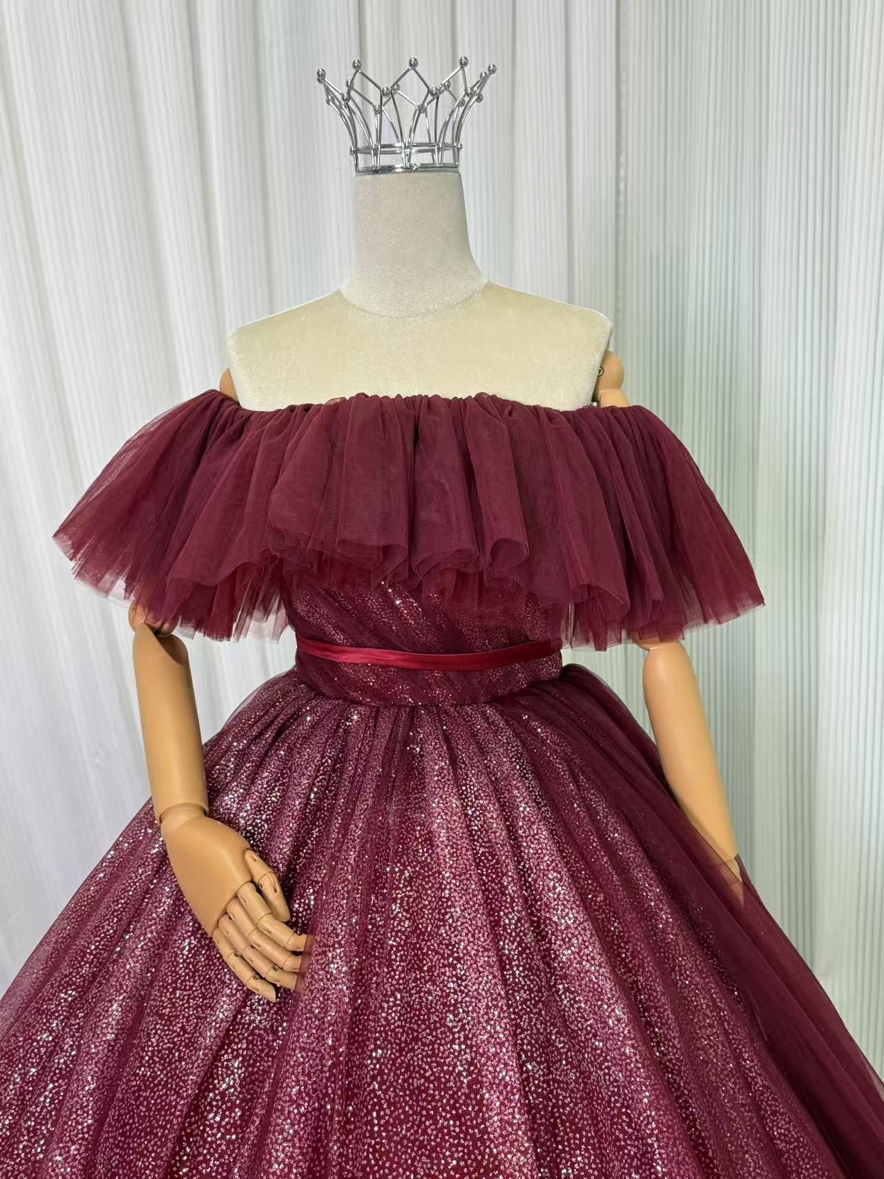 カラードレス ワインレッド オフショルダー 編み上げ サッシュベルト キラキラグリッターチュール 華やかなトレーン 花嫁 前撮り