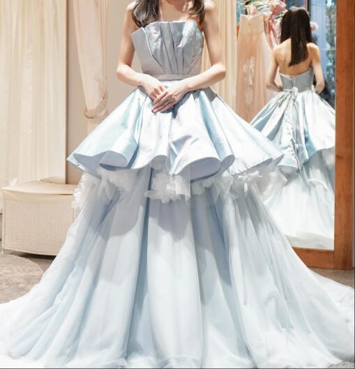 カラードレス 爽やかで優しいブルー チューブトップ 光沢感 デザイン感 華やかなトレーン 前撮り レイヤードドレス