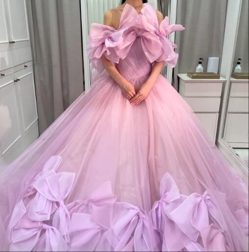 カラードレス ピンク オフショルダー リボン フリルトレーン 可愛い プリンセスライン 結婚式 前撮り