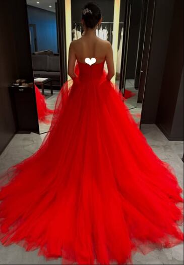 カラードレス ボルドー色 ベアトップ 柔らかく重ねたチュールスカート スレンダーライン ロングトレーン 花嫁 目立つ