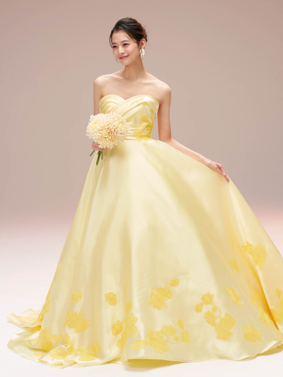 カラードレス 黄色い ベアトップ 目立つ 光沢サテン 繊細レース 華やかなトレーン 花嫁 前撮り
