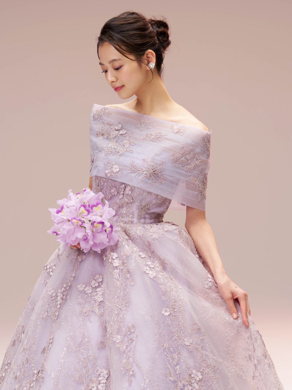 カラードレス オーキッド オフショルダー 優しい 繊細レース トレーン 結婚式 前撮り