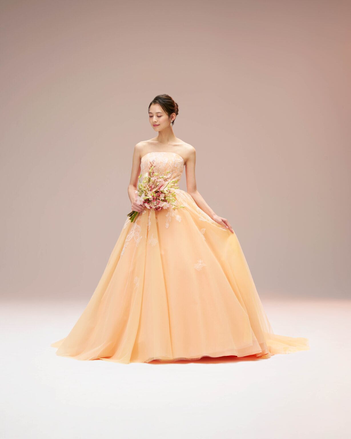 カラードレス オレンジ ベアトップ 編み上げ リーフ刺繍 ミニトレーン 可愛い 花嫁 前撮り