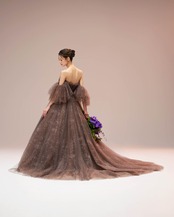 上品!カラードレス ブラウン 取り外し袖 チューブトップ キラキラグリッターチュール 華やかなトレーン 花嫁