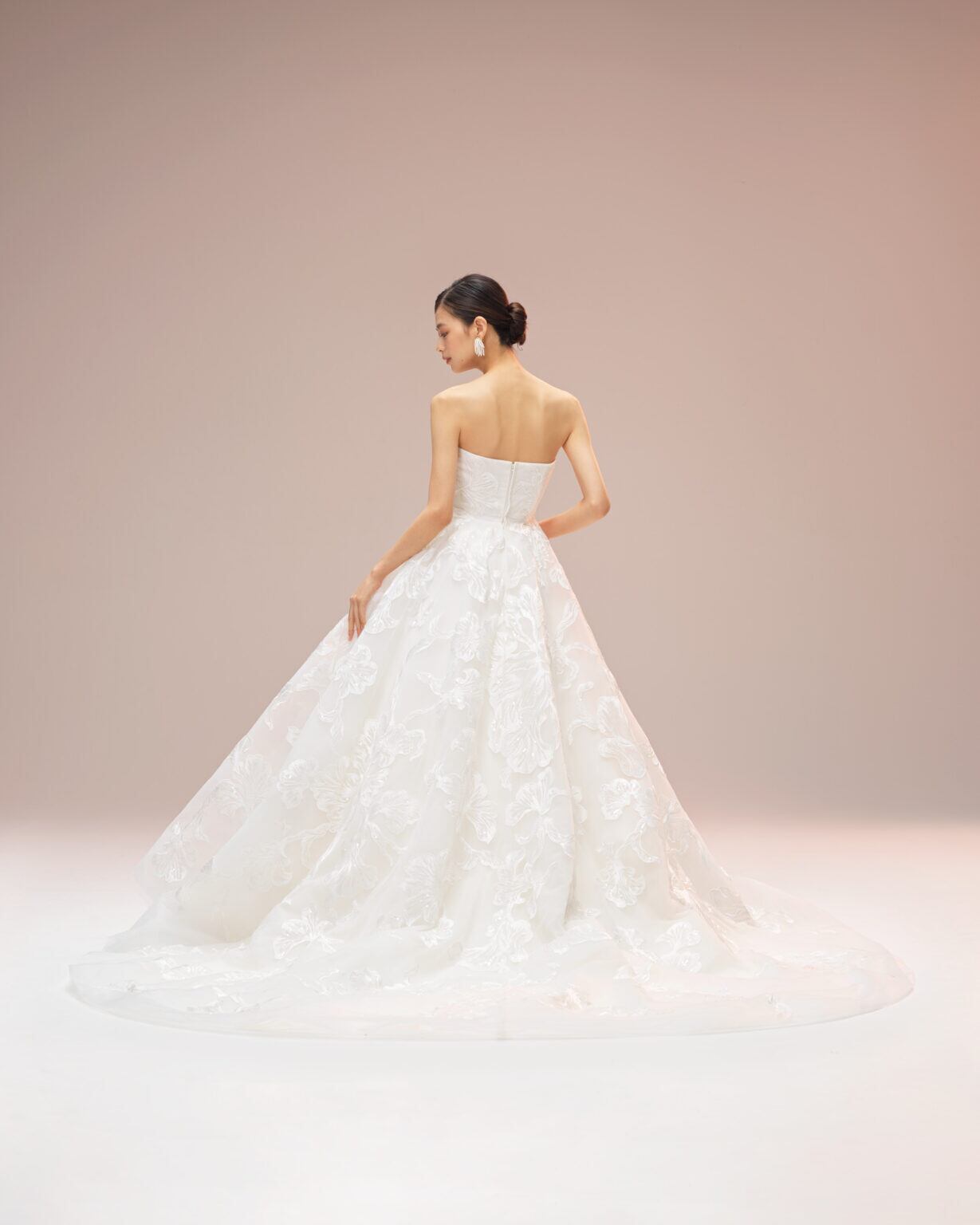 ウエディングドレス ホワイト ベアトップ ファスナー 美しい花レース 華やかなトレーン 花嫁
