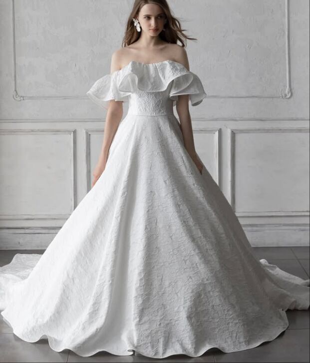 ウエディングドレス 純白 オフショルダー 華やかなトレーン マット生地 スレンダーライン 結婚式 前撮り