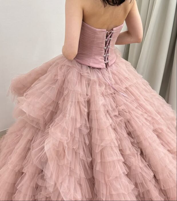 美品!カラードレス くすみピンク ベアトップ 編み上げ ソフトチュール 華やかなトレーン 花嫁 前撮り ティアードのドレス
