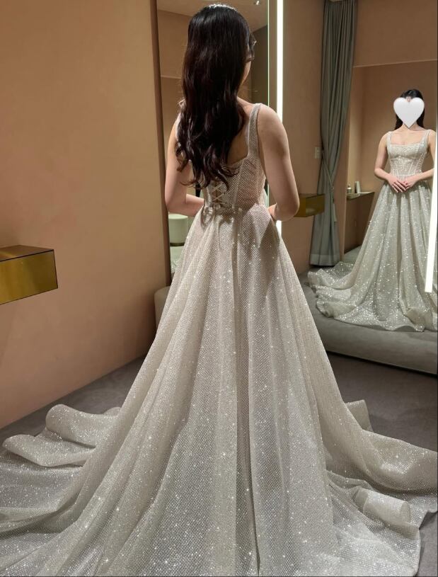ウエディングドレス オフホワイト キャミソール 編み上げ キラキラグリッターチュール 華やかなトレーン スレンダーライン 前撮り