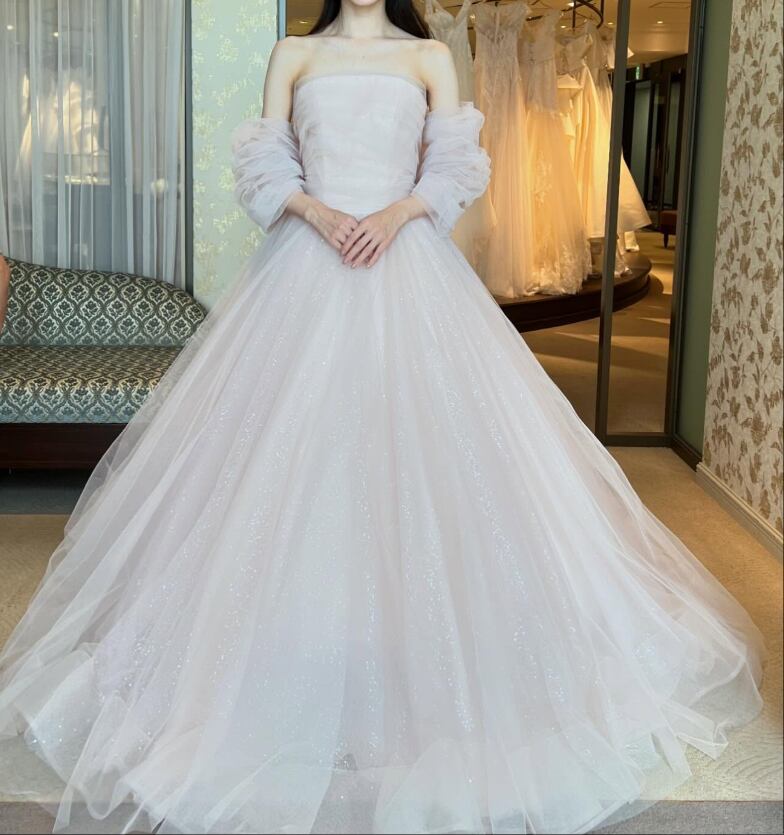 ウエディングドレス ホワイト ベアトップ ふっくら柔らかなバックリボン ソフトチュール 華やかなトレーン キラキラグリッターチュール 花嫁 前撮り