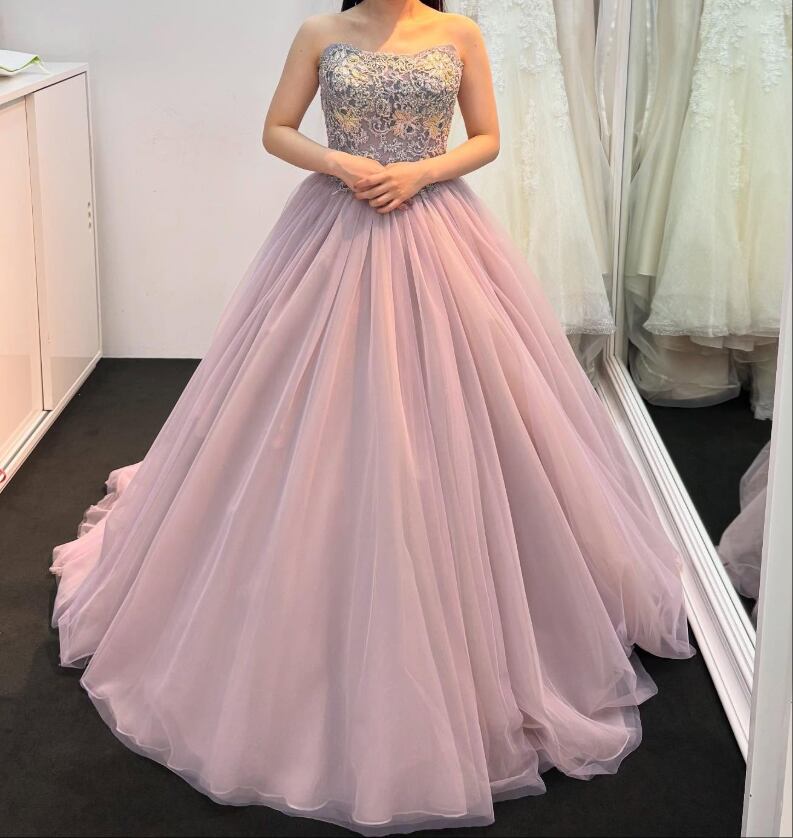 カラードレス くすみピンク ベアトップ ソフトチュール 美しい花レース 華やかなトレーン 花嫁 前撮り