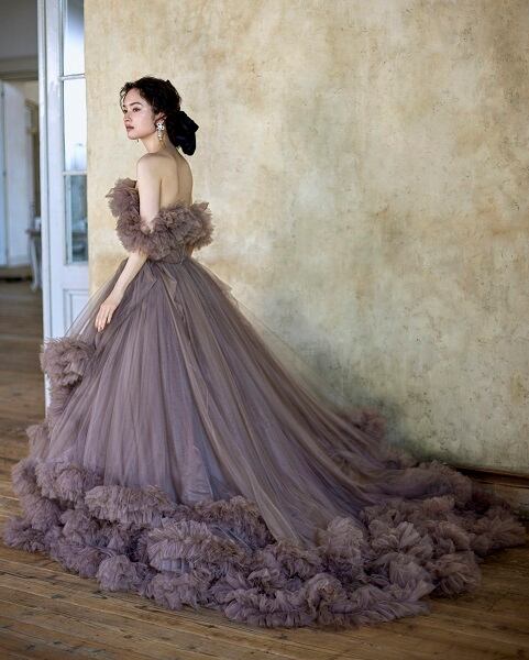 人気上昇!カラードレス グレー オフショルダー フリルトレーン ソフトチュール ティアードのドレス 花嫁 前撮り
