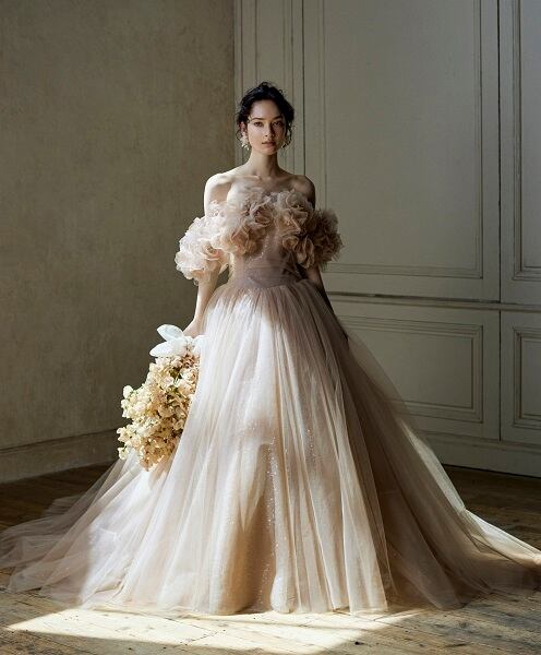 人気上昇!カラードレス ブラウン バラトレーン オフショルダー 華やかなトレーン キラキラグリッターチュール 花嫁 前撮り