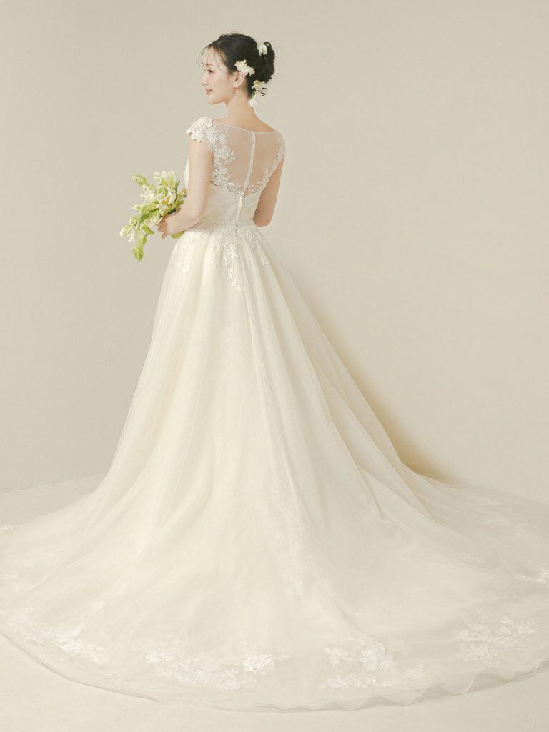 ウエディングドレス ホワイト ボレロ ラウンドネック 華やかなトレーン ソフトチュール 花嫁 前撮り