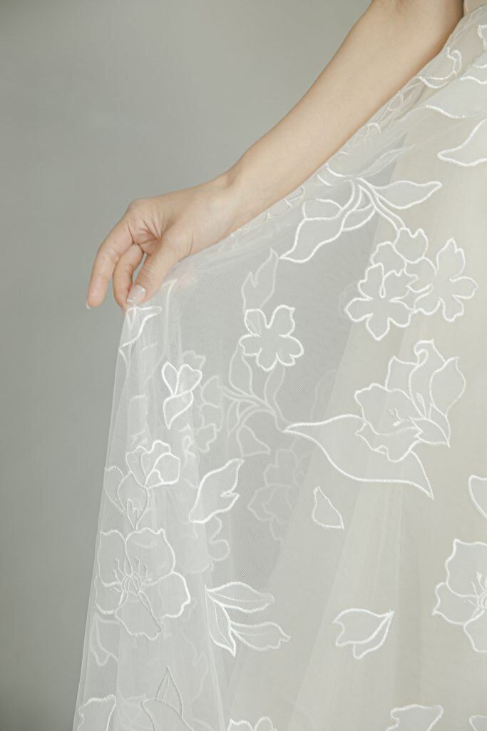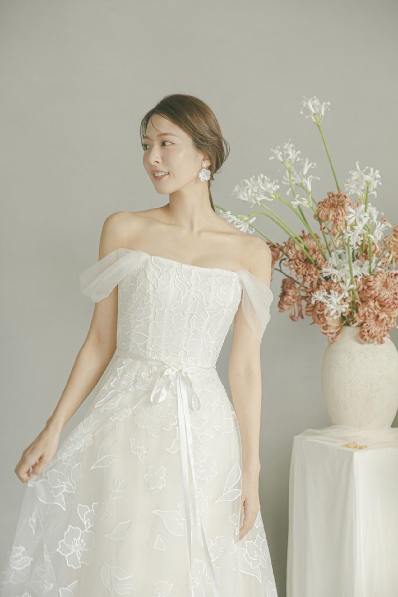 ウエディングドレス ホワイト サッシュベルト オフショルダー 咲き誇る透け花レース 華やかなトレーン 結婚式