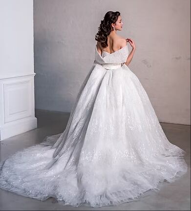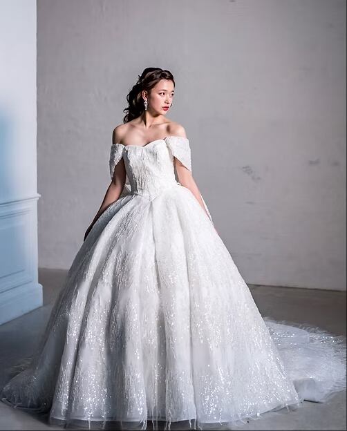上品!ウエディングドレス ホワイト 取り外しオフショルダー キラキラチュール ロングトレーン 披露宴/結婚式 憧れのドレス